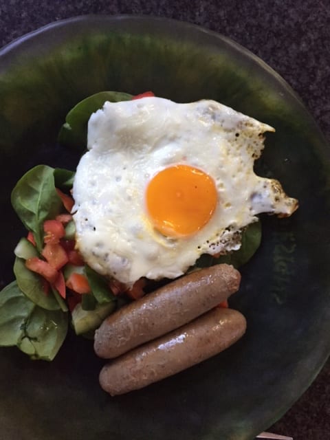 Placing an egg with a side of sausage on a bed of baby spinach and chopped tomato, capsicum and cucumber;