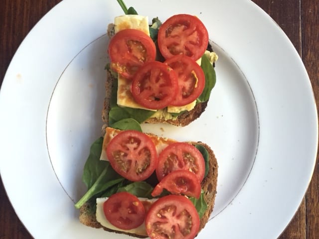 Haloumi on sourdough toast with avocado, baby spinach and tomato slices;