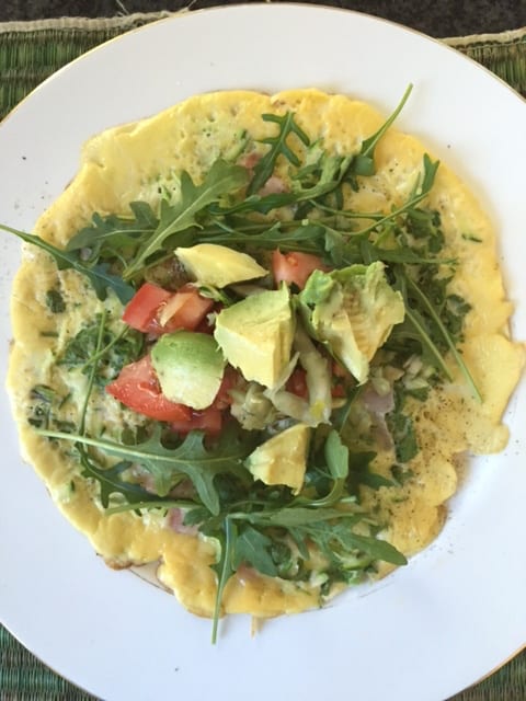 Open omelette with rocket, chopped tomato and avocado;