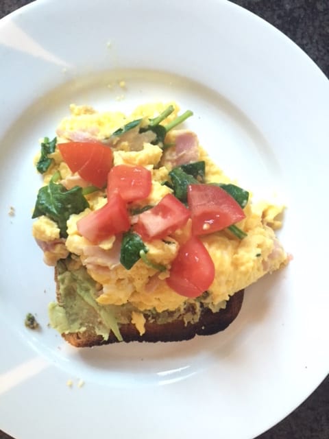 Sourdough with scrambled eggs, ham, herbs, baby spinach and tomato.